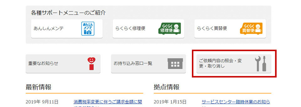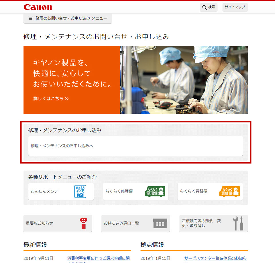 修理の問い合わせは修理・メンテナンスのお問い合せ・お申し込みから修理・メンテナンスのお申し込みへを選択します。