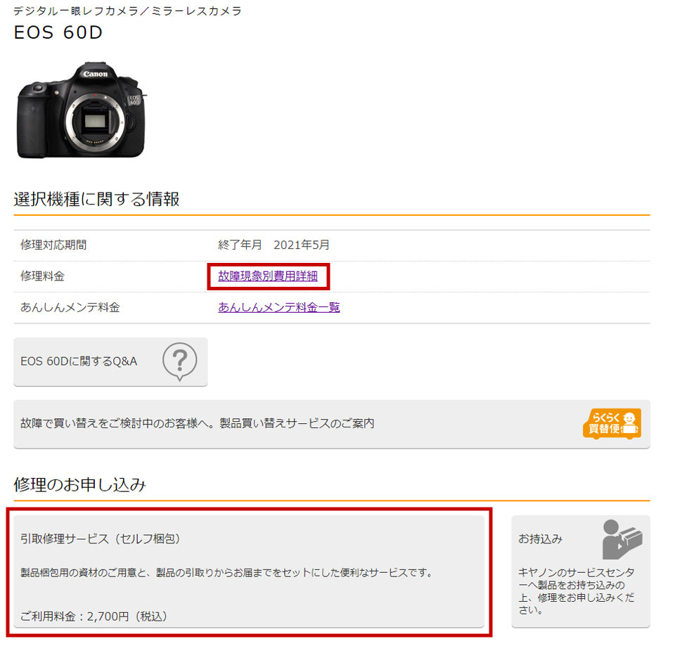 さらに部品代。それから、自宅に修理するカメラを取りに来てもらう場合には、引取修理サービス(セルフ梱包)を利用して2,700円(税込み)がかかります。