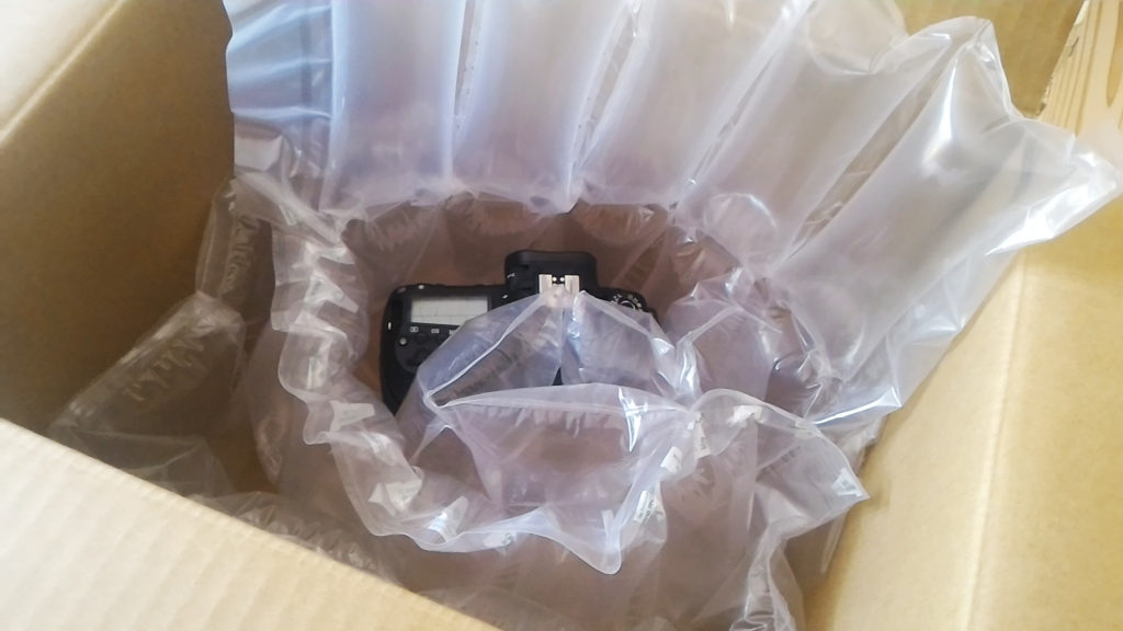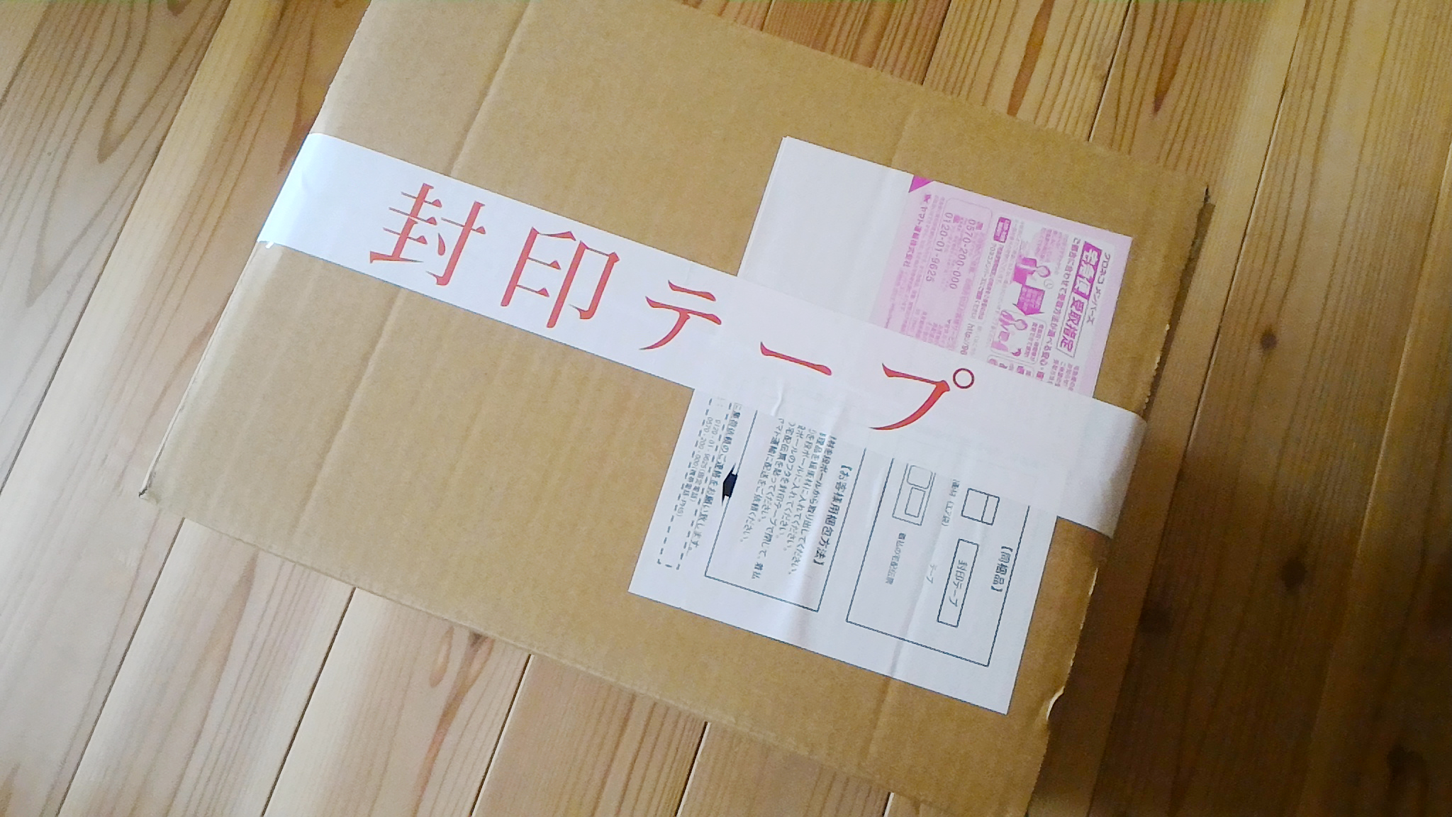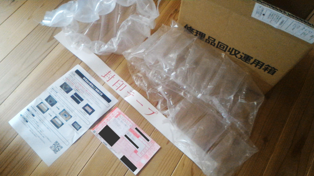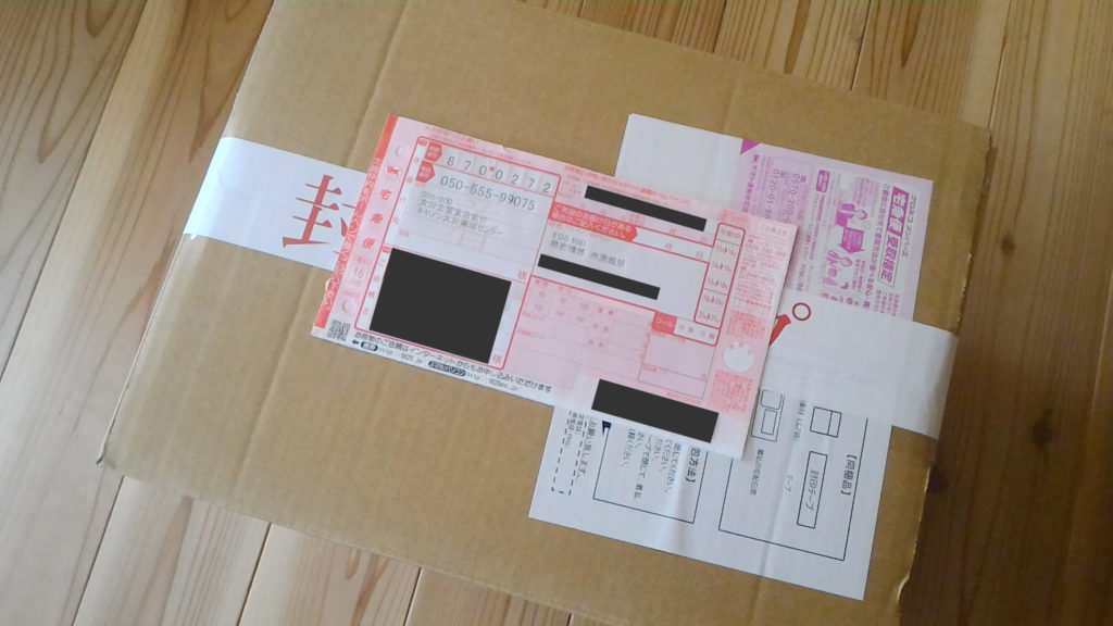 説明書にそって、カメラ(SDカードやバッテリーは外す)を入れて、梱包材も入れたら、封印テープで封をして、同梱されていた印刷済みの宛名を貼ってヤマト運輸に集荷依頼をかけます。